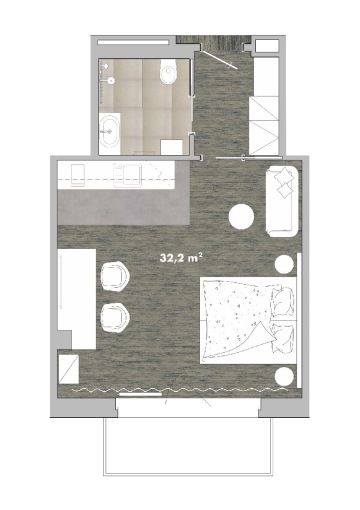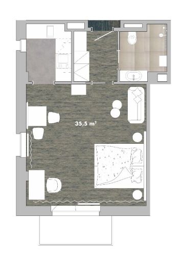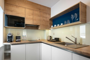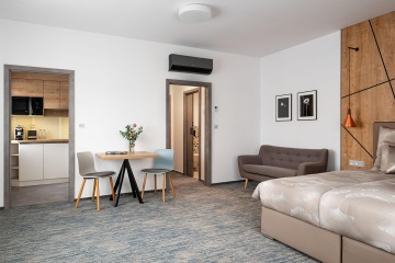The spacious double superior studio offers a fully equipped kitchenette with a Nespresso coffee machine, a work desk with an armchair, a comfortable sofa for relaxation, separately controlled air conditioning, and Wi-Fi. Most of the rooms include a balcony.