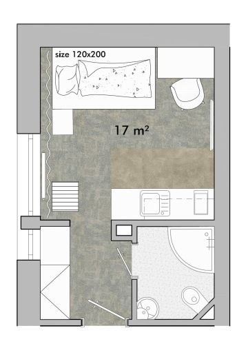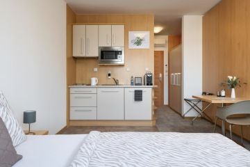 Jednolůžkové studio je vybaveno nejen pohodlnými širokými postelemi s kvalitní matrací, pracovním stolem, ale i plně vybaveným kuchyňským koutem s kávovarem Nespresso. Samozřejmostí jsou prostorné šatní skříně a digitální trezor.